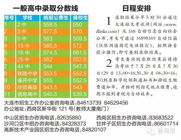 录取结果于7月29日早晨5:30通过大连招生考试网(网址:www.dlzsks.com)或168自动信息台向社会公布,考生可通过16898169自动信箱(仅限网通固定电话拨打),按照语音提示操作,即可查到录取结果。考生查询到录取结果后请持准考证于7月29日至7月30日(29日 13:00~16:30,30日08:30~16:30)到录取学校领取通知书和择校生缴费通知单,并按时到指定地点缴费,逾期不报到者视为自动放弃。