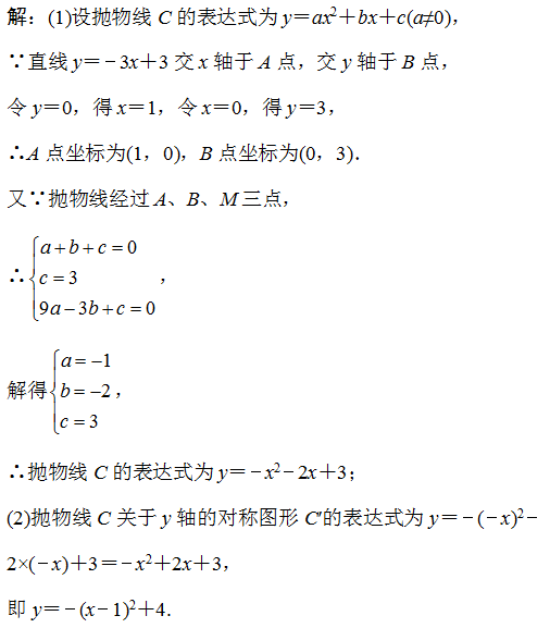 【思维教练】(1)要求抛物线C的表达式,根据题意过A、B、M三点可考虑运用待定系数法求得,又根据已知A、B分别为y=-3x+3与x轴、y轴的交点,可考虑运用分别令0法求得A、B坐标,从而求得抛物线表达式;(2)要求C的顶点D的坐标,可考虑先求出C的函数表达式,根据已知C与C关于y轴对称,可运用数形结合思想得到对称以后C图象上各点与C图象上对应各点相比,纵坐标不变,横坐标互为相反数即可求解;(3)要求使得△PAD∽△ABO的点P坐标,可考虑当△PAD与△ABO相似时,对应边成比例,根据比例关系式,求出AP的长,根据题意对应边不确定,则需要分情况讨论.