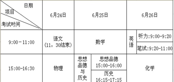 中考考试时间为6月24日-26日,地理生物考试时间为6月27日,两科总分的30%计入次年中考总分。今年我市对体育与健康进行无线智能化考试,总分60分,考试成绩计入中考总分。中考成绩按考试科目和总分继续以A+、A、B+、B、C+、C、D、E共八个等级呈现。