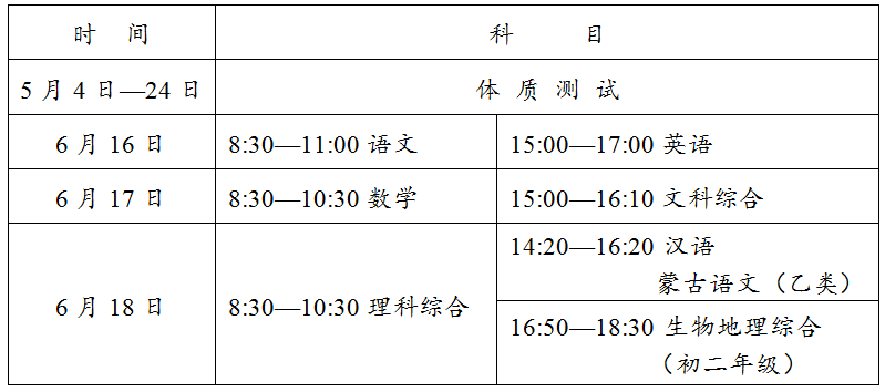 根据呼和浩特市教育局公布的《呼和浩特市2018年高中招生工作的通知》得知,呼和浩特2018年中考时间如下:
