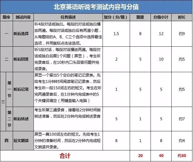 考试总分时长:中考英语听说考总分40分,考试时长为30分钟