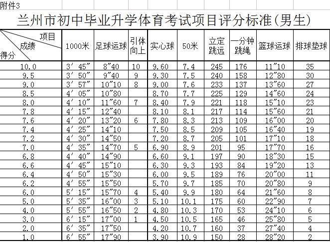 2017年兰州中考体育考试项目及评分标准(男生)