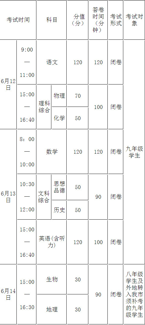 2017年初中学业水平考试科目:语文、数学、英语(含听力)、文科综合(思想品德、历史)、理科综合(物理、化学)。文、理科综合采用合堂分卷方式考试。