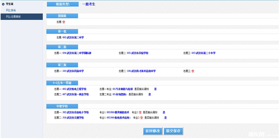 考生按事先填好的《考生填报志愿草表》(此表不用交学校),按批次选择报考学校。如下图: